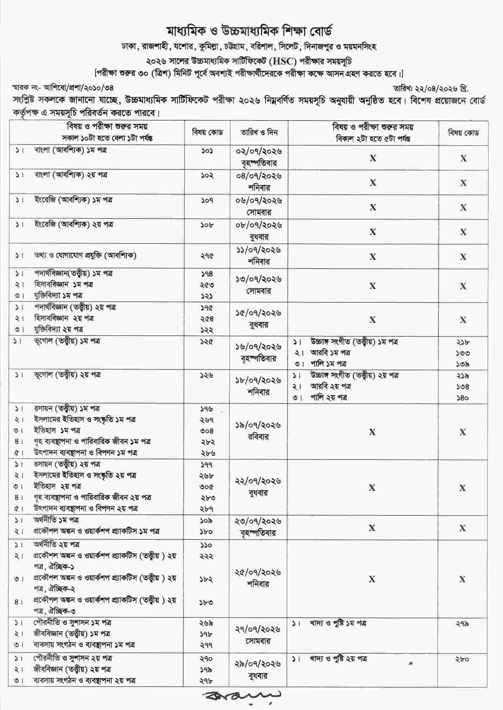 HSC Exam Routine 2026 PDF